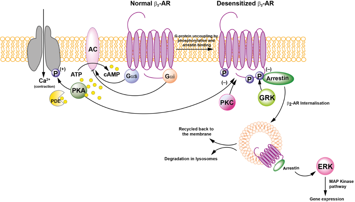 AC, adenylate cyclase; arrestin, β-arrestin; β2-AR, beta-2 adrenoceptor; Ca++, calcium; cAMP, cyclic adenosine monophosphate; ERK, extracellular regulated kinase; αs, heterotrimeric G-protein alpha subunit; Gαi, heterotrimeric G‑protein inhibitory subunit; GRK, G-protein receptor kinase; MAP kinase, mitogen-activated protein kinase; PDE, phosphodiesterase IV/3B; PKA, protein kinase A; (+), increases/activates, (-), decreases/inhibits; P, phosphorylation.